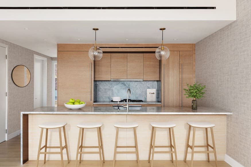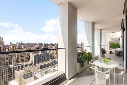 Upon entry, just beyond the initial walk-in closet, the sun-drenched living and dining areas unfold seamlessly onto the first private terrace, boasting over 48 feet of frontage along 28th Street. The exquisite chef's kitchen is appointed with a fully integrated suite of Miele appliances, including a dishwasher and wine refrigerator. Custom white oak cabinetry by Scavolini envelops the space, accented with oil-rubbed bronze surrounds and under-cabinet lighting. A Dornbracht faucet in a platinum matte finish adds the final touch to this culinary haven.
